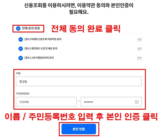 4) 이용약관을 확인하시고 전체 동의 완료 및 이름/주민등록번호 입력 후 하단의 본인 인증을 클릭합니다.