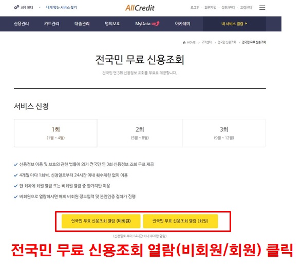 3) 전국민 무료 신용조회 열람(비회원/회원)후 열람 버튼을 클릭합니다. 가입 절차가 불편하다면 비회원으로 열람하셔도 상관 없습니다.