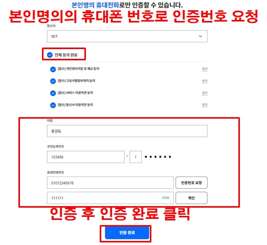 5) 본인 명의의 휴대폰 번호로 인증번호 요청 및 확인 후 하단의 인증완료를 클릭합니다.