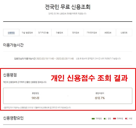6) 개인의 신용점수 조회가 완료되었습니다. 개인 신상정보 및 신용 관련 정보들을 한눈에 확인할 수 있습니다.