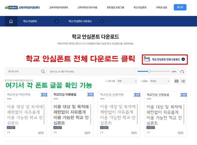 앞으로는 문서 글꼴을 사용할 때 이런 저작권 위반 관련 걱정을 하지 않으셔도 되겠습니다. 교육부와 한국교육학술정보원에서 학교안심글꼴 총 24종을 개발하고 보급했기 때문입니다. 그것도 무료로 말입니다. 학교와 교육기관은 물론 일반국민도 내려받아 자유롭게 사용이 가능하다고 합니다. 저작권 없는 문서 글꼴 디자인을 어디서, 어떻게 받는지는 제가 간단하게 설명해 드리겠습니다.