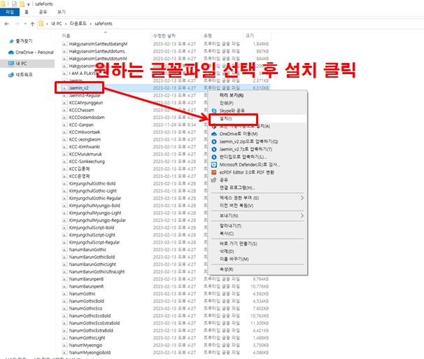 2) 폴더에 들어가 설치하고자 하는 글꼴파일 선택후 오른쪽 클릭합니다