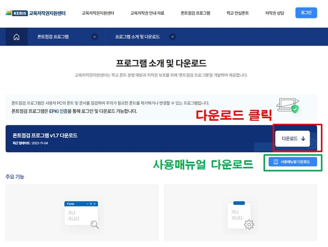 2) 폰트점검 프로그램 v1.7 다운로드 클릭 (사용매뉴얼 다운 가능)