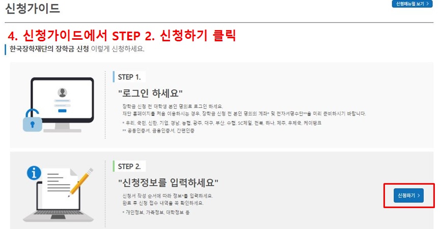 2) 신청정보 입력 (신청서 작성 순서에 따라 정보 입력 (개인정보, 가족정보, 대학정보 등))
